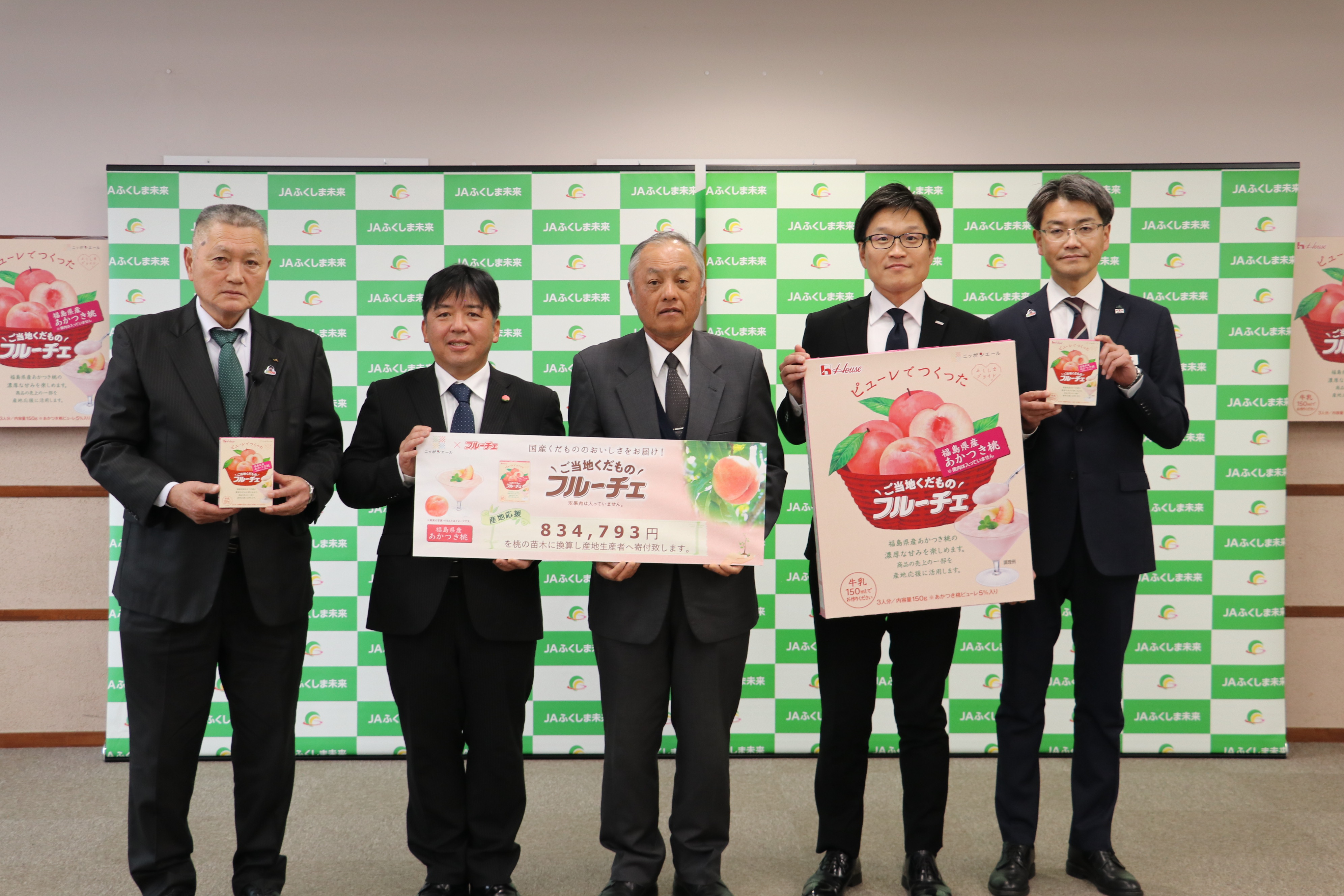 ハウス食品は25日、福島市の当JA本店を訪れ、「ご当地くだものフルーチェ福島県産あかつき桃」の売り上げの一部をJAに寄付しました。