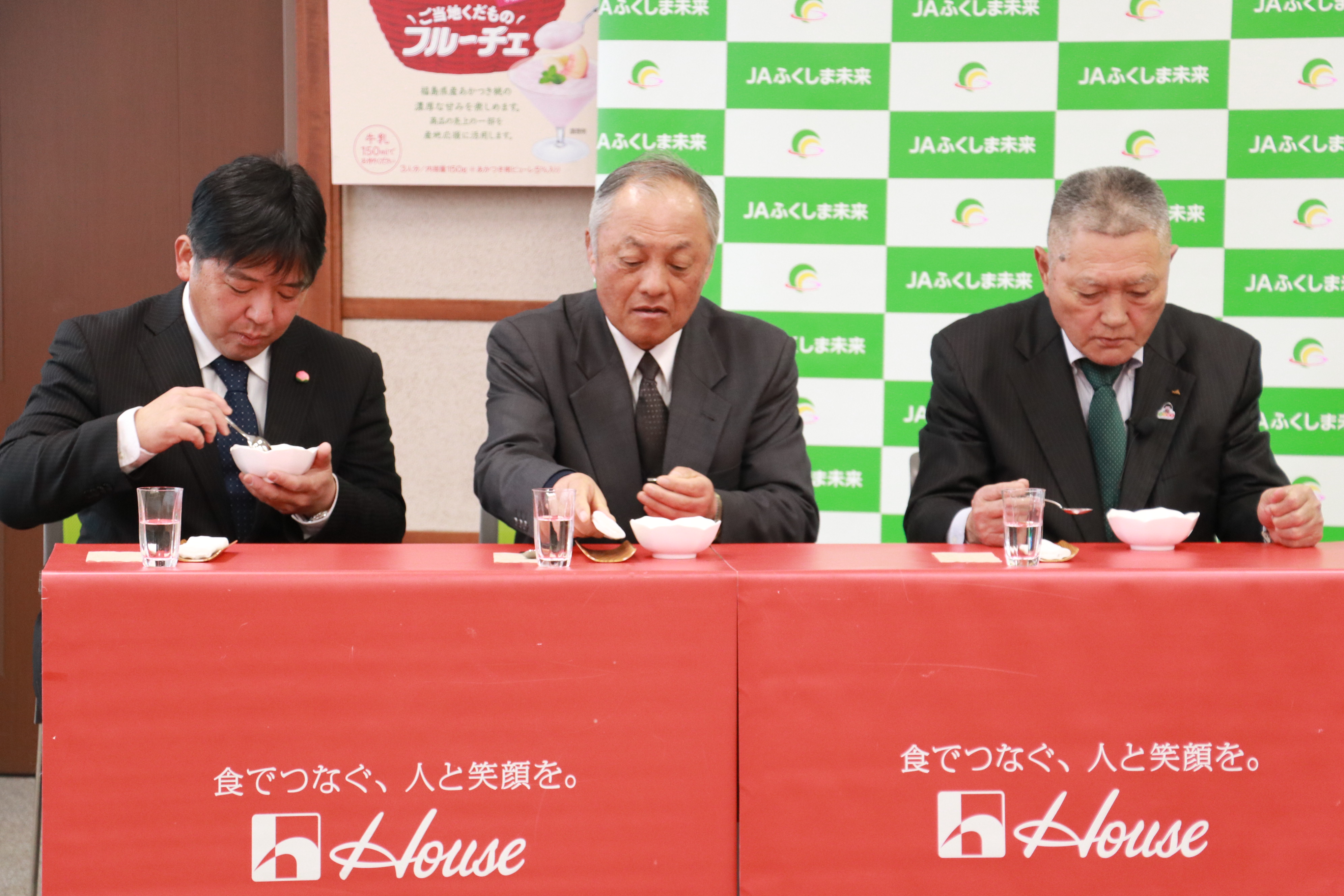 三津間組合長は「JAは年間約1万本の桃の苗木を生産者に供給し、品質向上を目指して改植に取り組んでいる。ハウス食品との取り組みを産地の発展につなげていきたい」と話しました。大槻会長は「桃を加工に使ってもらうことも消費拡大につながる。全国の皆さんに引き続きあかつきを使ったフルーチェを味わってほしい」と呼びかけました。