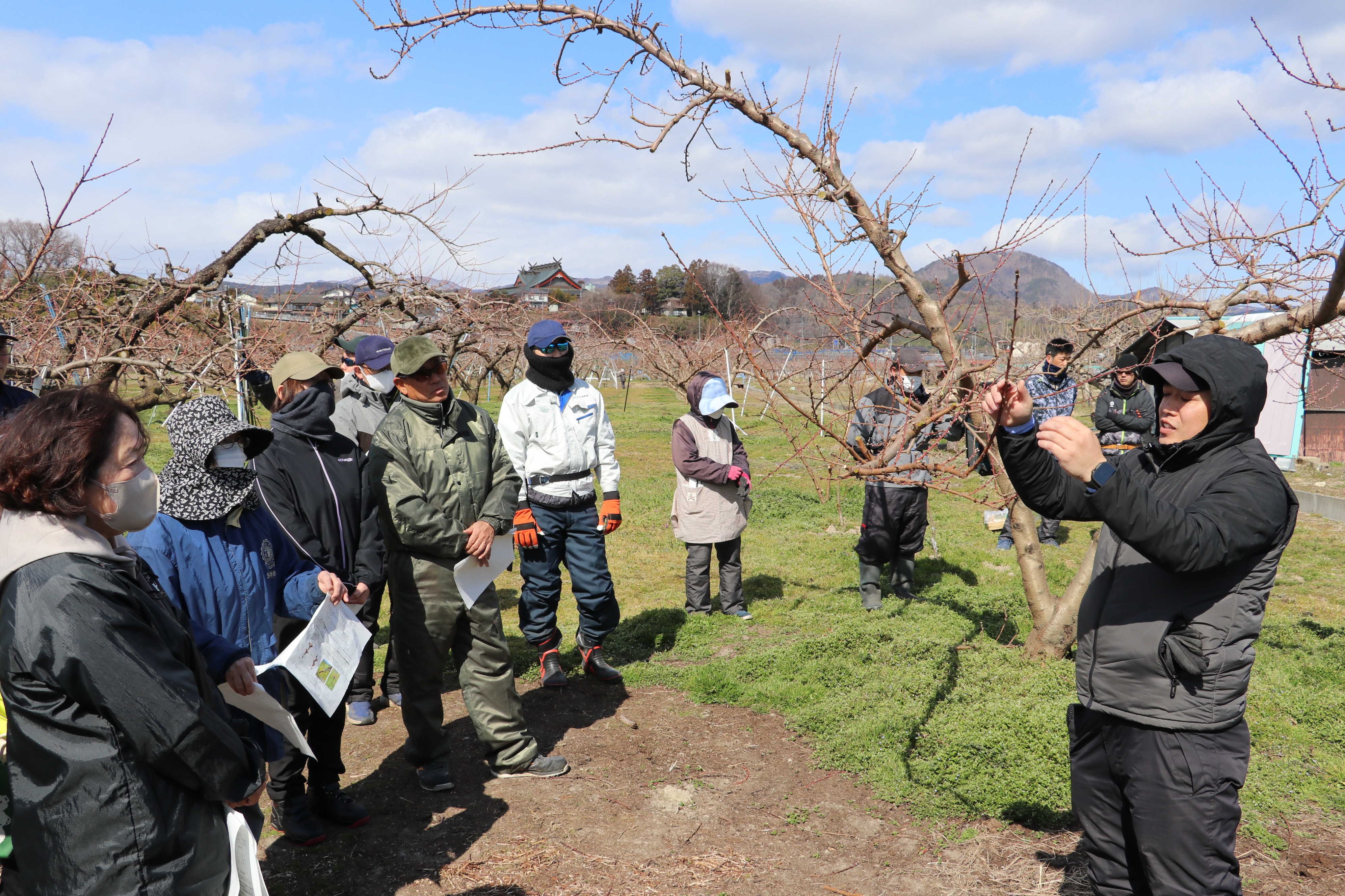 当JA福島地区は9日、福島市内の桃園で新規栽培者を対象とした摘蕾指導会を開催しました。就農3年以下の生産者や若手生産者ら約30人が参加し、桃栽培の基礎となる作業を学びました。