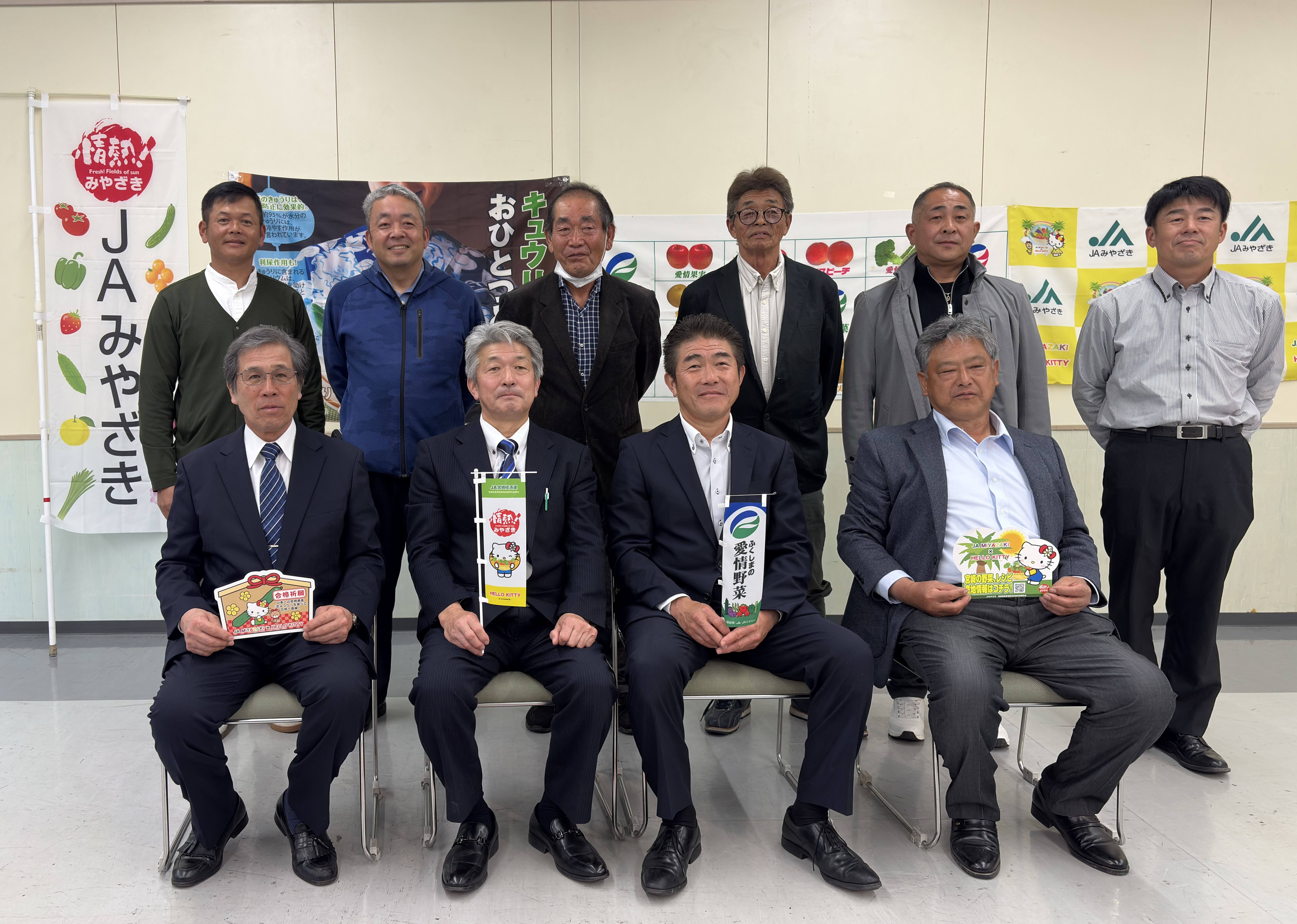 現地では、両県の産地状況や販売戦略を意見交換。宮崎では「キティちゃん」を使った販促や、福島の「キュウリビズ」など、消費者へのPR手法を共有しました。圃場(ほじょう)視察では、天敵の導入やワクチン苗の課題、苗価格の違いなど現場の最新事情を情報交換。選果場では効率的な出荷体制や人材確保の工夫も学びました。