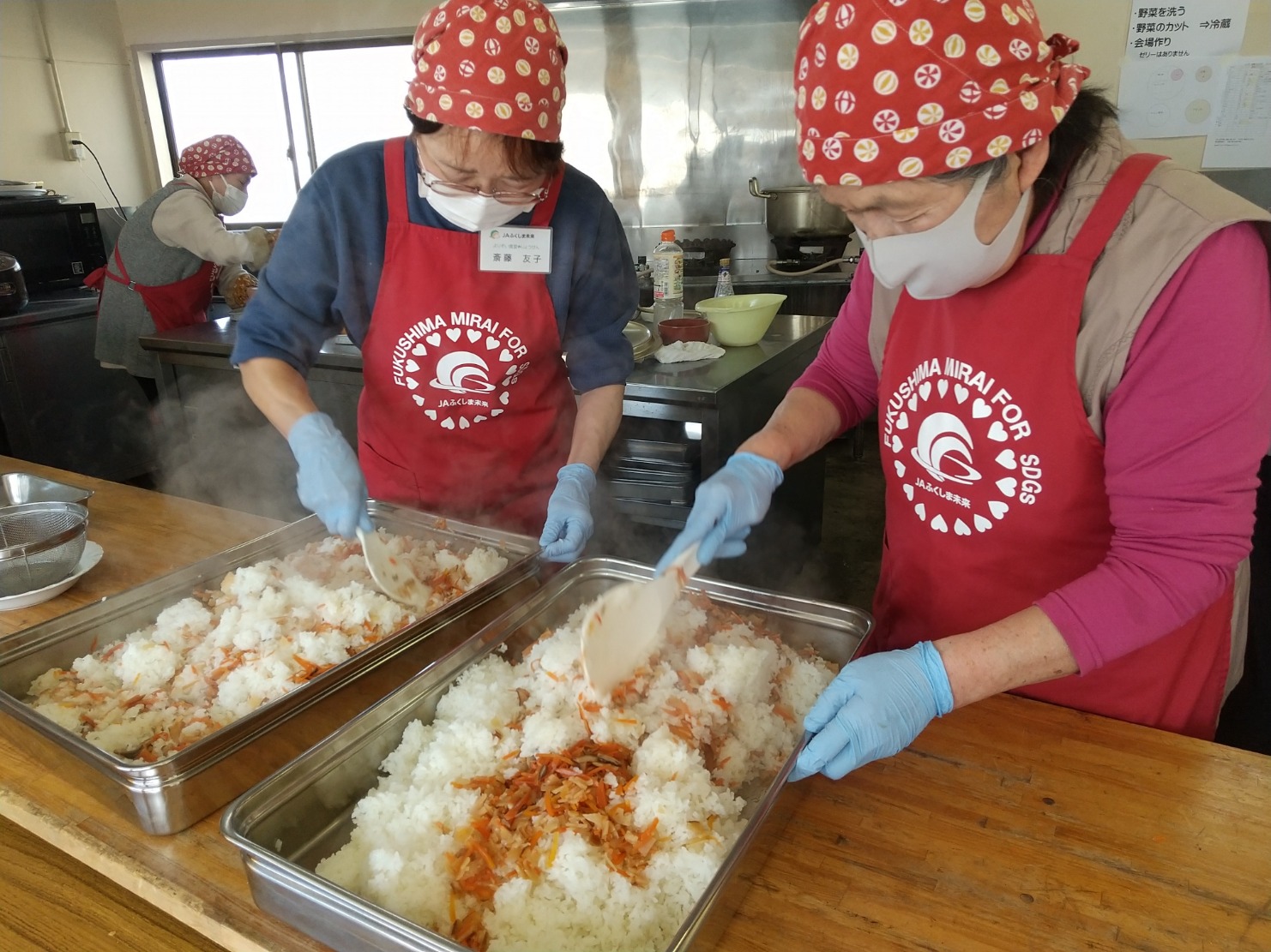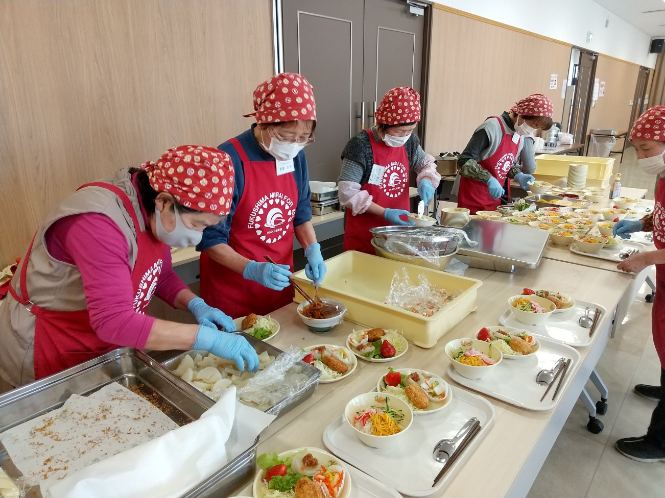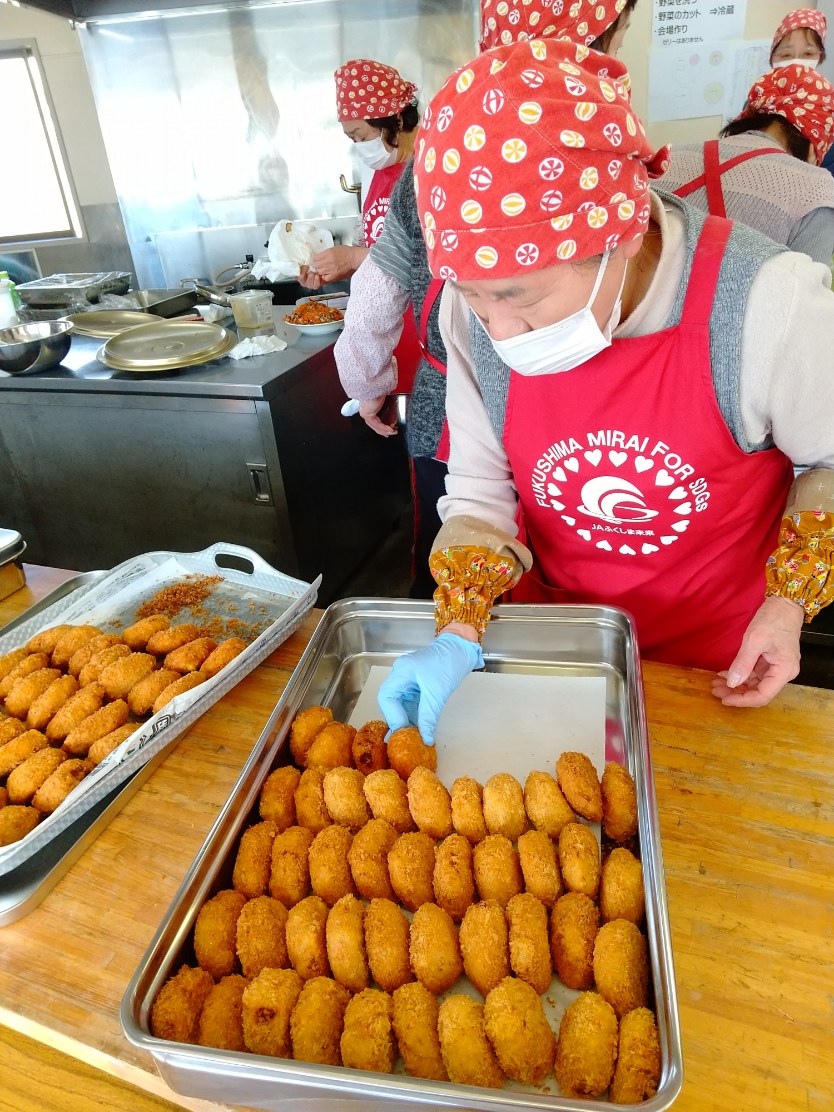 当JA伊達地区本部は14日、伊達市霊山町の「みらいホールかけだ」で、こども食堂・みんなの食堂「よりそい食堂りょうぜん」を開いた。同地区女性部員が毎月第2土曜日に運営しており、この日はちらし寿司や手作りコロッケ、地元産イチゴなど、季節の味覚を65人に提供しました。初めて訪れた地域住民は「久しぶりに手作りの食事を楽しめた」と笑顔を見せました。