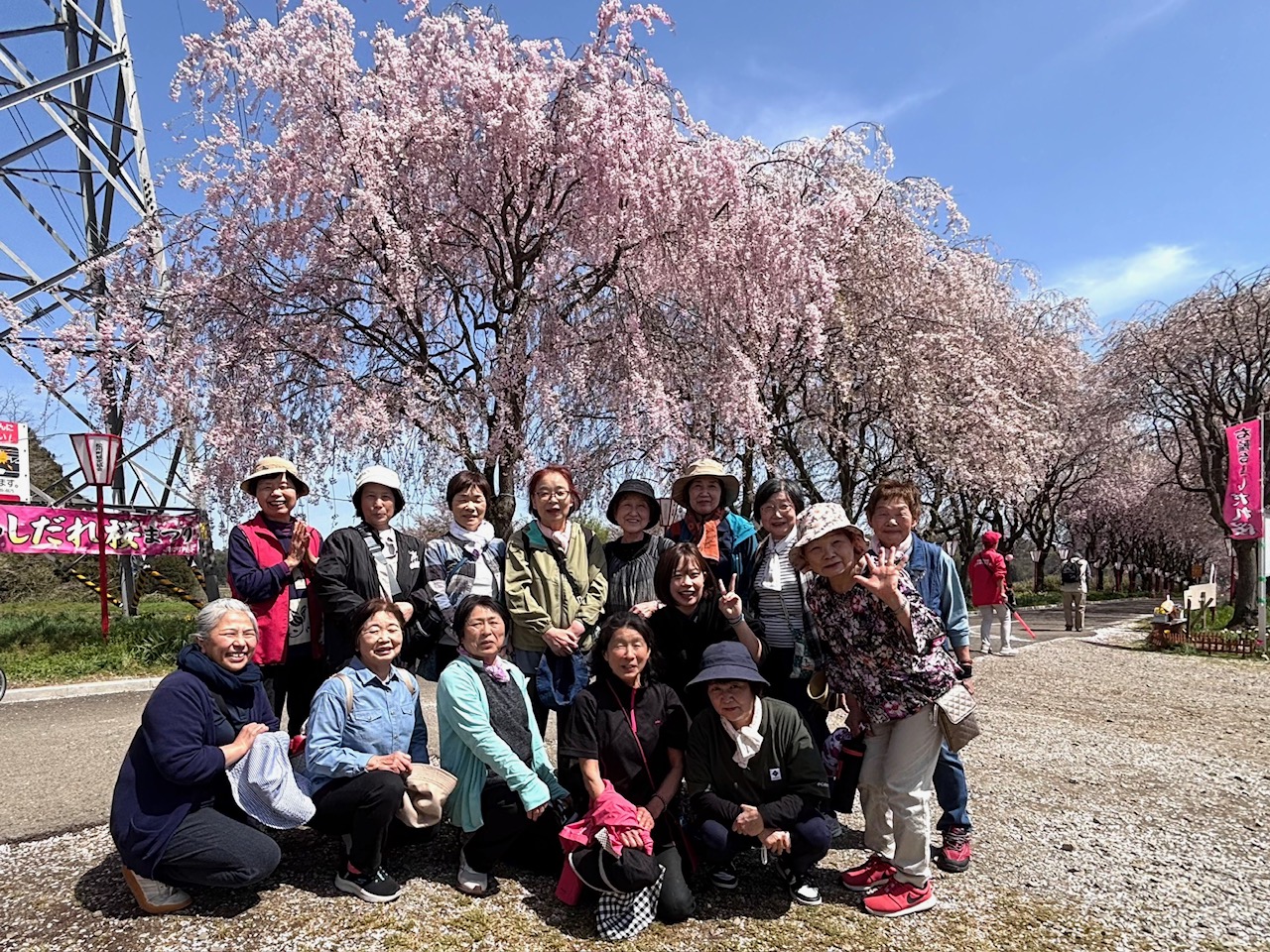 当JA女性部水原支部は17日、お花見ウォーキングで「右輪台山のしだれ桜」を訪れました。部員15人が参加しました。