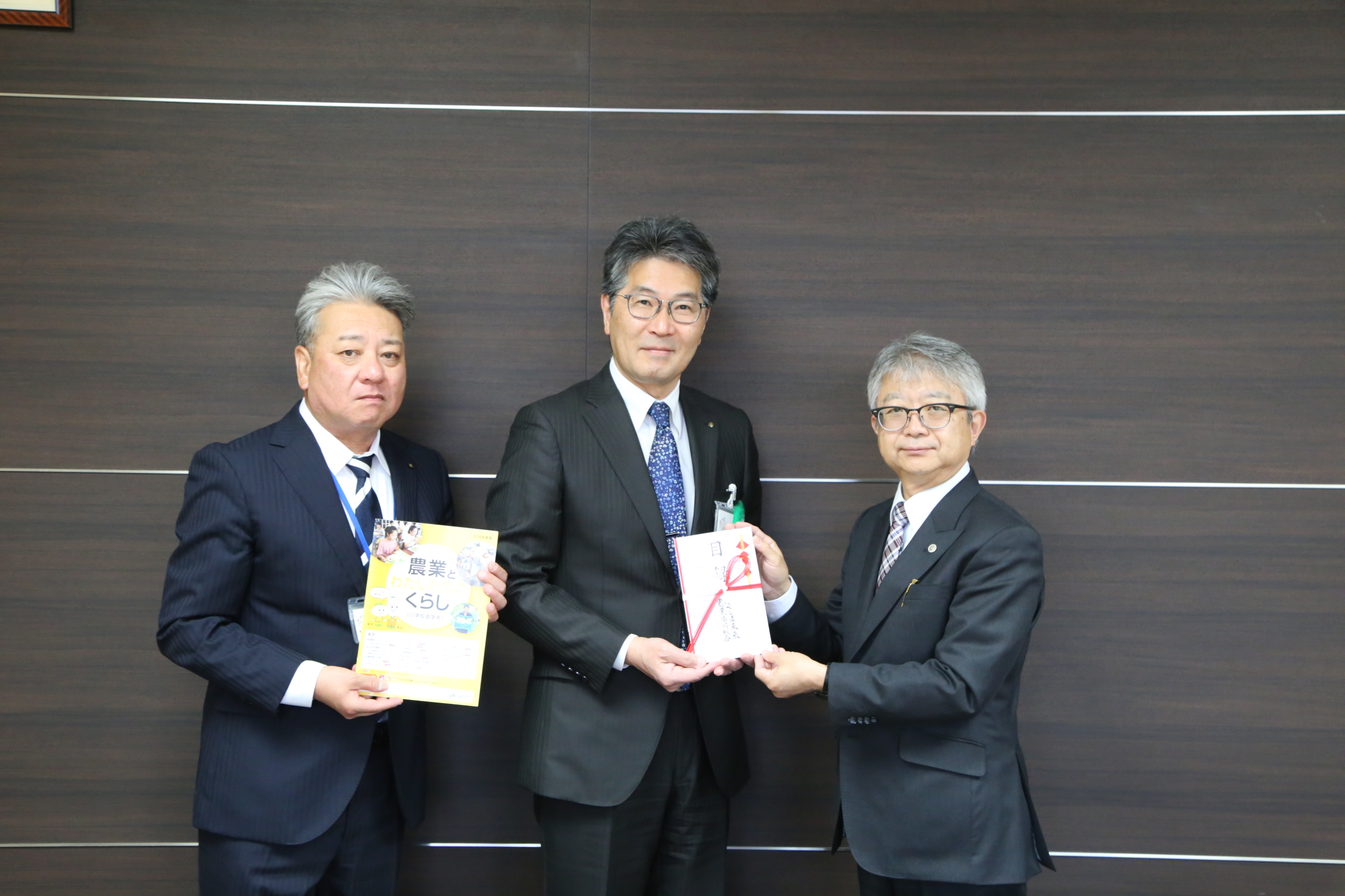 当JA福島地区本部は27日、次世代への食農教育の一環として、小学生向けの補助教材「農業とわたしたちのくらし」を福島市と川俣町の教育委員会に贈呈しました。管内の小学校計44校へ、合計2045冊が届けられます。