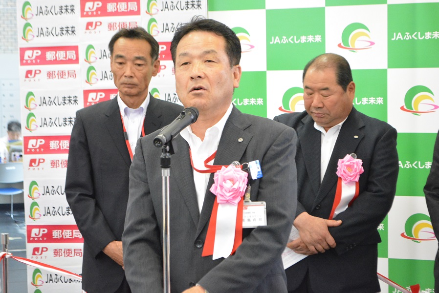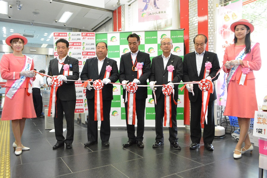 セレモニーにはJAや郵便局の関係者約20人が出席し、日本郵便(株)福島県北部地区連絡会の髙島貞邦統括局長は「郵便局のネットワークを生かし、全国にふくしまの桃を広めたい」とあいさつ。JAの安彦慶一専務など5人でテープカットを行いました。セレモニー後には、JAの桃ジュース「桃の恵み」やキュウリのプレゼントも行いました。