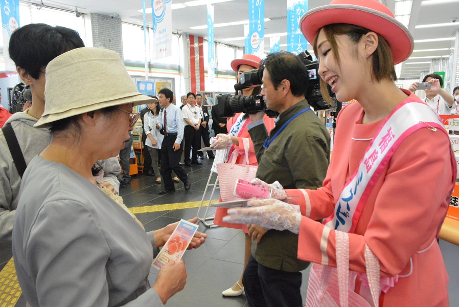 日本郵便(株)が行う特産品の通信販売サービス「ふるさと小包」で5日から、JAふくしま未来のブランド桃「伊達の蜜姫」の申込み引受けが始まりました。当日は福島市の福島中央郵便局で引受開始セレモニーを行い、来局者に申込書やチラシを配布。今年は生育が順調なことからJAでは、約5000箱(1箱3㎏)の伊達の蜜姫が全国各地に発送できると見込んでいます。