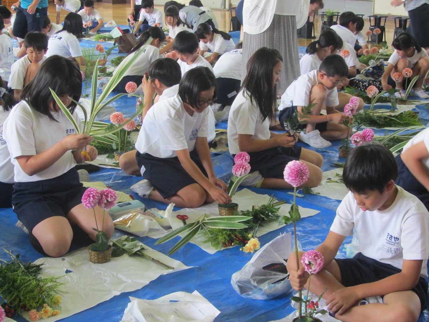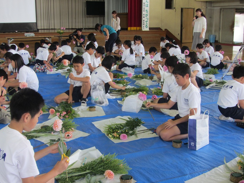 授業では花き協議会取締役の阿部ひろみさんが生け花の歴史や七夕の由来について解説し、池坊の根本三四子さんが児童たちに生け方を指導。児童たちはダリアを織姫と彦星に見立てるなど一人ひとり自由に作品を仕上げ、また、クイズなどで花について知識を深めました。