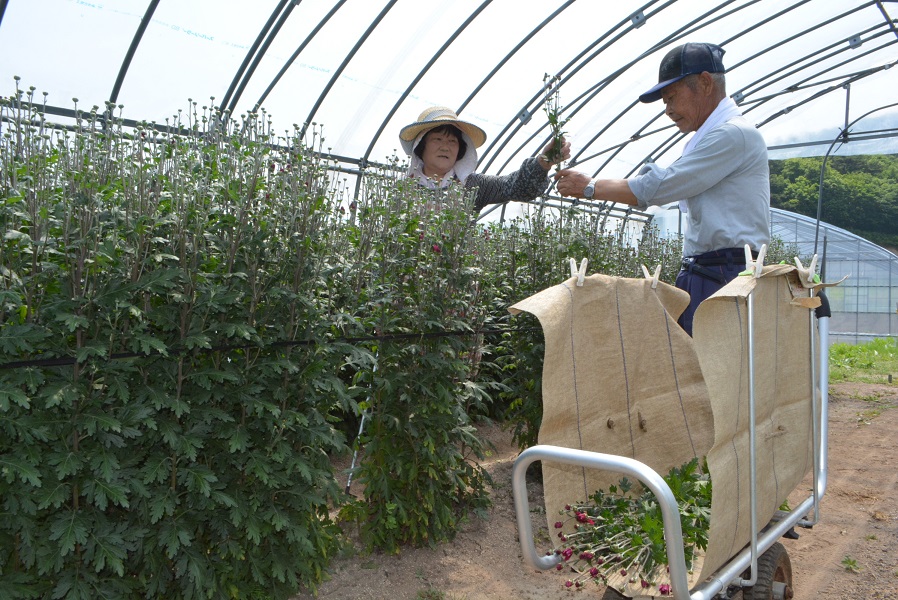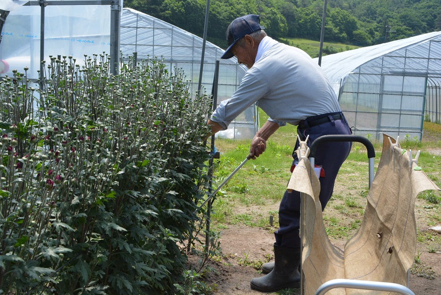 小菊の出荷は12日から開始。一部寒さの影響で変色が発生しましたが、こまめに管理を続けたことで生育もよく病気の発生も無い状況です。JAの営農指導員は「昨年定植して、3~4月の時点では伸び悩んでいた。そこから思い切ったかん水をしたことで、背丈もボリュームも申し分ない」と話します。進さんは「今年は様子を見る年。今年見えた課題を来年改善していきたい」と意欲を述べました。