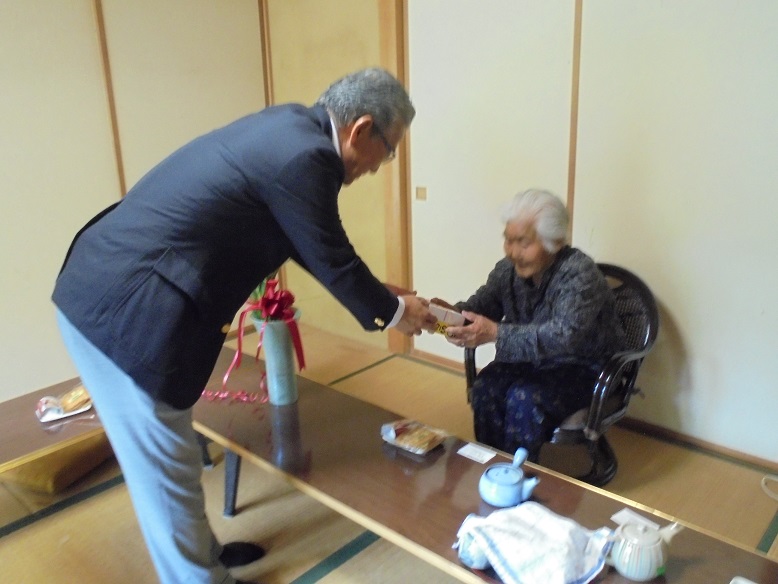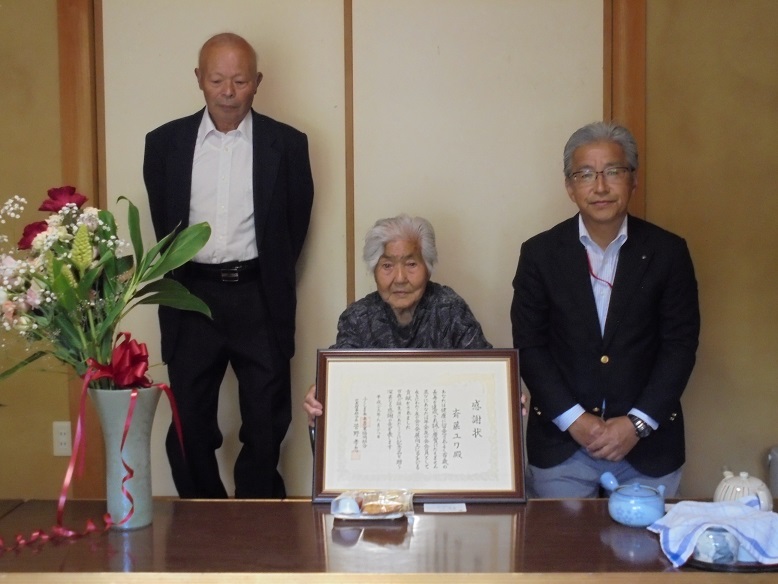 伊達郡川俣町の斎藤ユワさんが28日、100歳の誕生日を迎えました。当JAの斎藤政治福島地区本部長と斎藤喜好年金友の会川俣支部長、佐藤敏克代表支店長が長寿祝いで自宅を訪れ、ユワさんに感謝状や記念品を贈呈しました。